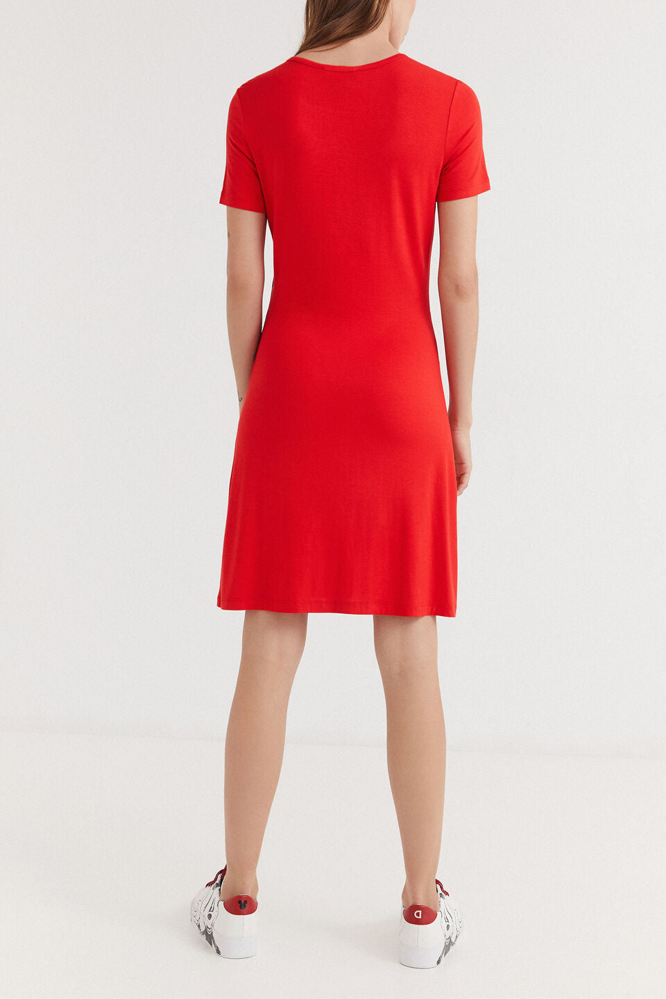 Short-sleeved, straight-line Desigual t-shirt dress in vibrant red, with a large, edgy Mickey Mouse graphic on the front. Its soft, stretchy fabric comfortably follows your shape, while the classic round neckline and above-knee length give it a relaxed, sporty appearance. Ideal choice for everyday wear, city walks, or travel – just add white sneakers and a small bag, and you've got a cheerful, playful outfit ready.